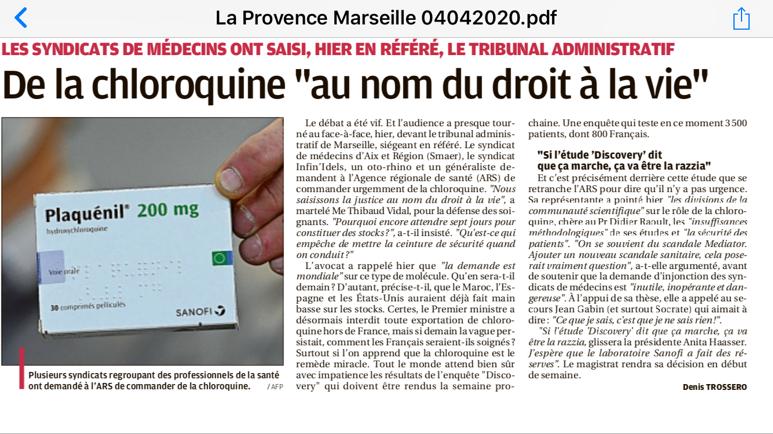 Le débat a été vif. Et l’audience a presque tourné au face à face, hier, devant le tribunal administratif de Marseille, siégeant en référé. Le syndicat de médecins d’Aix et Région (SMAER), le syndicat Infin’Idels, un oto-rhino et un généraliste demandent à l’agence régionale de santé (ARS) de commander urgemment de la chloroquine.